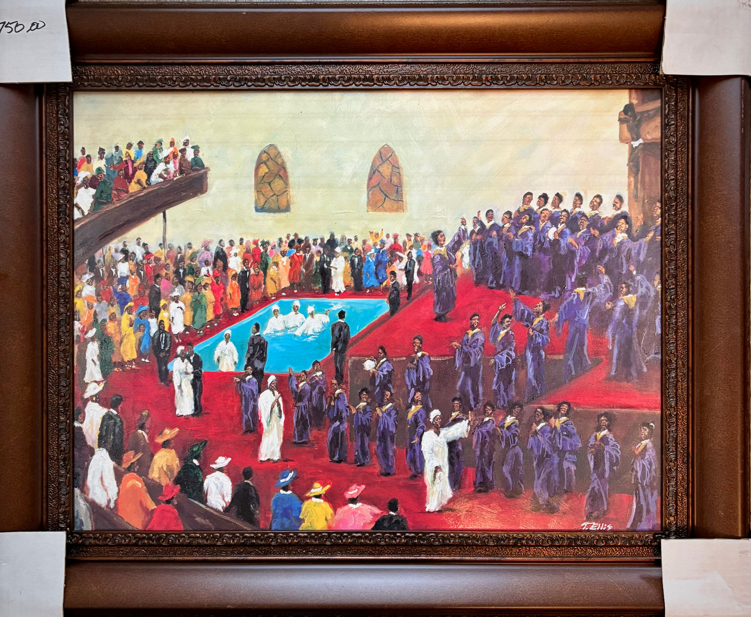 T. Ellis brings the moment to life with bold strokes and expressive color, highlighting the unity, joy, and sacred energy that fill the room. From the stained-glass windows to the packed balconies, every detail honors the beauty of faith and the power of community coming together.