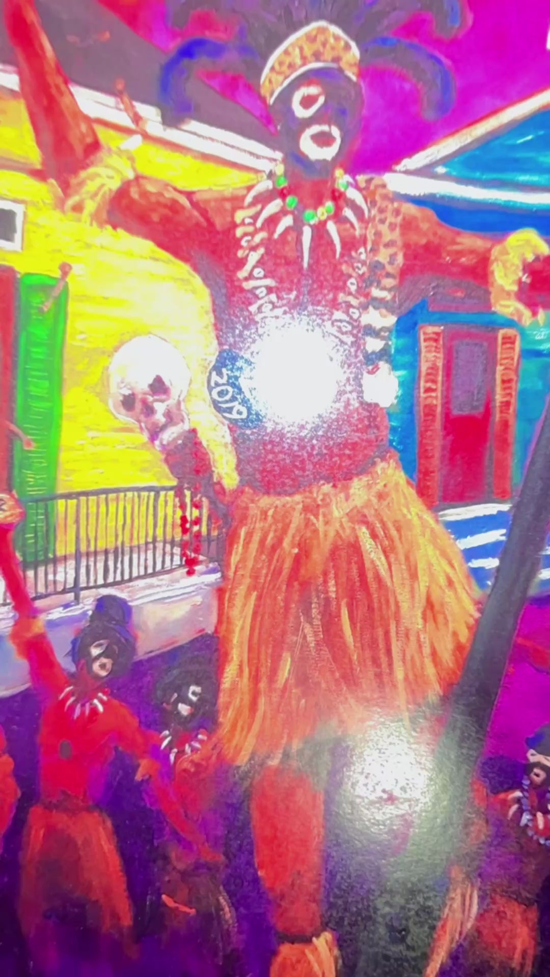 Ted Ellis captures the electric spirit of Mardi Gras in this vibrant depiction of the Zulu parade. Bold strokes of fiery reds, purples, and golds fill the scene as elaborately costumed performers dance through the streets of New Orleans.