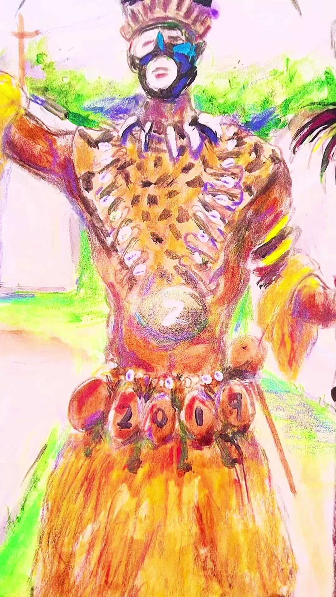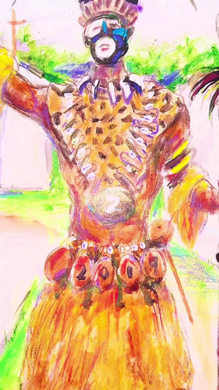 “The Zulu King” is a powerful tribute to the vibrant spirit, pageantry, and ancestral pride embodied in New Orleans’ Zulu tradition. Through layered texture and bold color, T. Ellis captures the commanding presence of a ceremonial Zulu figure—adorned in feathers, shells, and traditional regalia that honor the rich cultural legacy behind Zulu’s century-old Mardi Gras history.